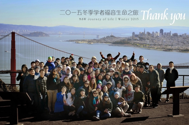 冬季训练之后,学者福音举办了2015年冬季生命之旅,12月28日至2016年1月3日,在这一周里,我们跨过了新年。本次共有105位圣徒参加,包括北美在学圣徒、全时间训练学员、少数海外圣徒和服事者。此次相调之旅我们前后访问了北加约十处召会的圣徒,主不仅丰厚地祝福了我们,也祝福了我们所访问的每一处地方。以下是本次生命之旅的一些亮点: