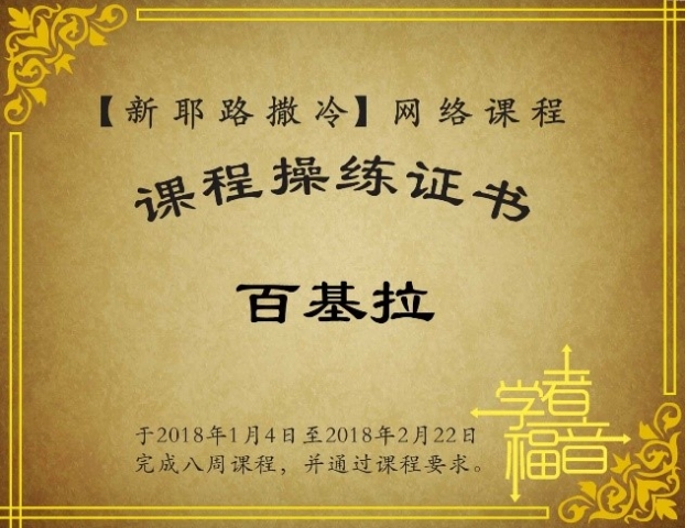 “新耶路撒冷”系列 八堂课20项作业全部完成者,可以获得“课程操练证书”,以兹鼓励。在这八周里,共有130位弟兄姊妹完成了每一项的作业。