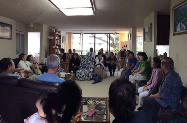 夏威夷众召会三天四堂的相调特会,于2015年1月30日上午,以在一对高龄德裔圣徒Burnett家的相调拉开了序幕,他们的家在欧胡岛(Oahu)中部的米里拉尼市(Malilani)。太平洋中央这个美丽的岛屿,不愧为有“世界小熔炉”之称。这个小小的聚会,竟汇集有三十多位来自十一个国家和民族的圣徒,济济一堂,一面拜访探望这对年长的圣徒,一面拉开特会的前奏,享受美好的相调、见证和交通。Rita Burnett老姊妹虽已身患绝症,却仍然灵里刚强,对各地圣徒的来访深感激动。她的刚强、对主绝对的爱、对众圣徒的爱,使众人深受激励。大家齐声欢唱“何大神迹,何深奥秘!神竟与人联调为一!……”当地圣徒在爱心里的摆上,众人以欢跃单纯的心一同用饭。圣徒里面神圣生命水流的交通,见证了基督身体的一,见证新人的实际!
