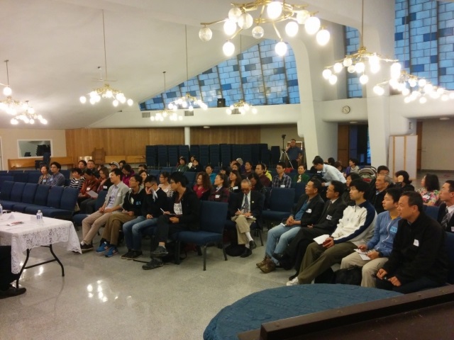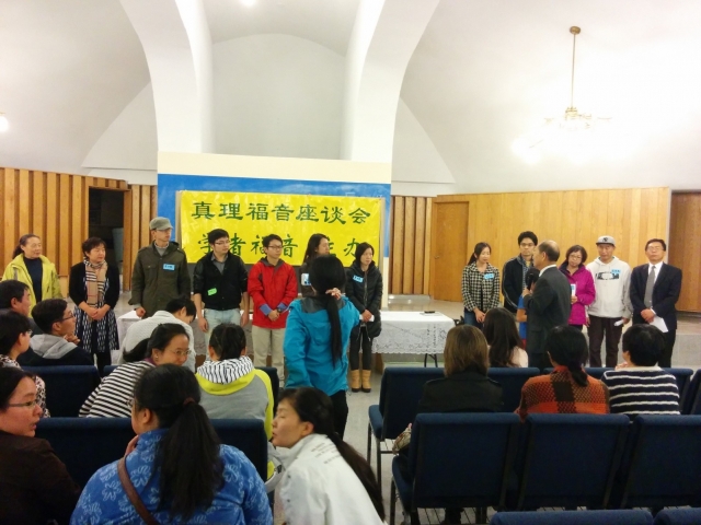 赞美主,因为李弟兄与白弟兄两位主的仆人前来服事,蒙特利尔召会于2014年10月18日举办了一场福音真理座谈会,约有120位圣徒及福音朋友与会, 其中福音朋友超过30位, 大多数是年轻人, 包括国际留学生与新移民。第一段聚会为福音真理座谈, 由李弟兄弟兄与白弟兄主讲, 并有蒙特利尔的5位弟兄在身体里一起配搭,借着回答福音朋友的提问,阐明基要真理,使圣灵藉此软化听者的心土。 福音朋友的问题集中在是否有神,圣经是本怎样的书,以及如何信神等。