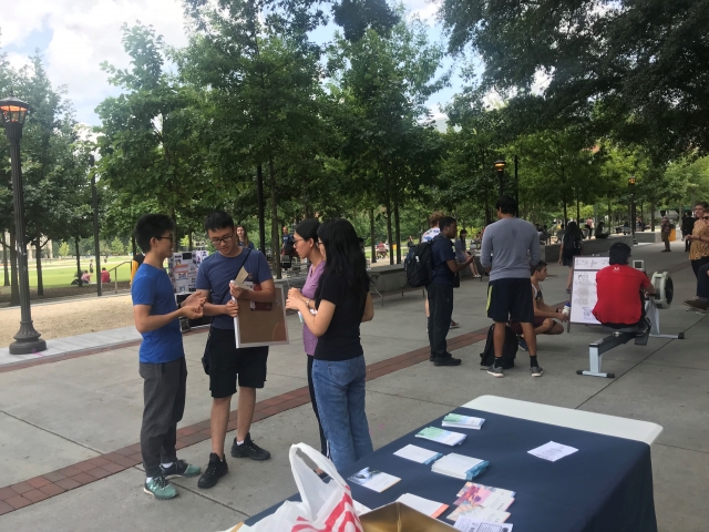 到了周四、周五更有两天的摆桌子传福音,弟兄姊妹都积极的把时间摆上,一同配搭传《主悦纳人的禧年》为福音,这福音的火实在烧着了亚特兰大的校园,主带来很多平安之子,有时都让我们不敢相信,很多人和我们一同呼求主名,一同向主认罪悔改,一同祷告转向主,主实在愿意这火烧在地上!烧遍校园!