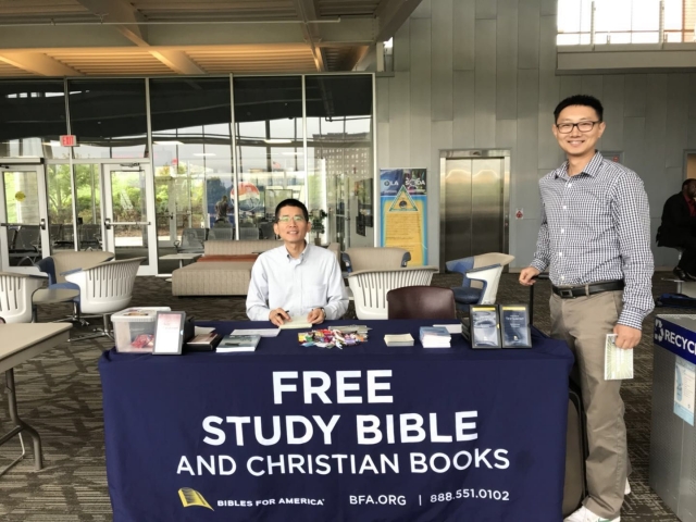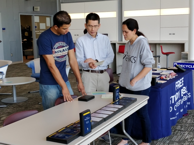 9月19日我们在Omaha 的MCC-South 南校区,摆BFA桌子,接触人,传福音。这个校园学生不多,但是我们的桌子摆在两栋教学楼的连接处,且是必经之路,所以过往的学生,我们总是可以跟他们打招呼,介绍并邀请来我们的桌子。因为人不多,所以我们可以和学生们一个一个的介绍社团,并讲解恢复本圣经。一天下来,我们也拿到了20多位的学生的名单,求主记念。