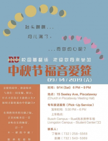 已过的9月14日,在Piscataway召会会所举行了面向Rutgers校园的中秋节福音爱筵。当天共有40位左右福音朋友前来,其中绝大多数是刚从国内过来的新生。弟兄姊妹们都带来了丰盛的食物和月饼,用餐时也都主动积极地问候、关心在场的同学们,让离乡背井的他们感到了家的温暖。饭后借着分组研讨、诗歌、见证和福音信息,新同学们对于神有了进一步的认识。福音聚会过后,有七位福音朋友填回响卡表示愿意接受主,并有一位姊妹受浸。愿主继续加强祂在Rutgers的工作!