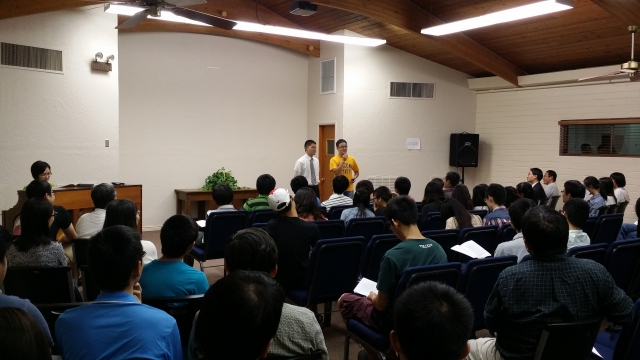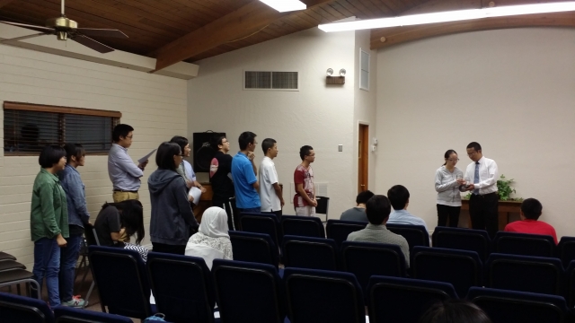 聚会结束之前弟兄们呼召大家奉献自己。感谢主,所有的学生圣徒都愿意奉献,将自己的学业、婚姻甚至一生交给主。还有几位在职的圣徒起来奉献,一位姊妹做见证说她虽是儿童班长大,却是第一次公开的奉献。