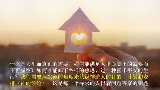 什么是人里面真正的需要?如何能获得满足而不再空虚?怎样才能卸下各样焦虑,过一个喜乐平安的生活?我们需要从生命的角度来认识神造人的目的、计划和安排,也就是“神的经济”、“神的经纶”(God's economy)。这是每一位寻求者得着答案的密钥。