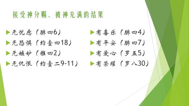 神要进到人的灵里,作人的生命、内容,成为人的满足。祂先把自己分赐到我们的灵里,再从我们的灵扩充到我们的魂里,最后叫我们的灵、魂、体都充满神,被神浸透,圣经称这个结果为“得荣耀”。接受神的分赐、被神充满的结果就是:无忧虑,有喜乐;无恐惧,有平安;无嫉妒,有爱心;无仇恨,有荣耀。