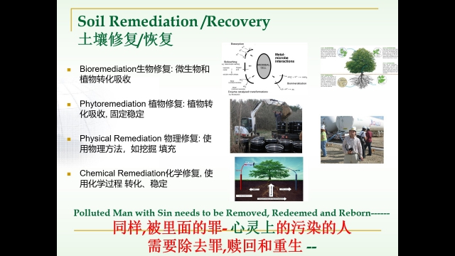 土壤的污染导致了疾病(如癌症,皮肤病,出生缺陷等)与死亡。比如镉会导致病痛,阻止骨骼的生长;砒霜会导致皮肤疾病或死亡。污染很容易,修复却需要很长时间。同样的,我们人因罪被污染,需要借着主的救赎将我们赎回,使我们得着重生。韩教授也分享了他得救的经历。