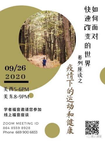 9月26日,美国西岸时间下午5点,学者福音举办了第十二期线上福音座谈,主题为“疫情下的运动和健康”。我们邀请到了就职于美国北卡罗来纳中央大学郭教授作为主讲人,从运动对人身心健康的益处来认识神创造的人是如何的奇妙。人有灵魂体三部分组成,每一部分都可以操练。有约400余位上线参加了此次座谈。