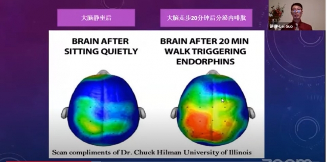 郭教授继续阐述到,运动对抑郁症能起到很好的治疗作用。运动使人愉悦,减轻疼痛。锻炼有助于控制焦虑和抑郁。虽然运动看起来对人是很有益处,但是运动并不是万能的。郭教授也曾经思考过,人为什么会死?人有没有永生?人生的意义是什么?这样的问题带着他认识神。他认识到,要有健康愉快的生活,不只是要锻炼身体,还要信主耶稣操练灵。就如提摩太前书四章八节所提到的:“因为操练身体,益处还少;惟独敬虔,凡事都有益处,有今生和来生的应许。”